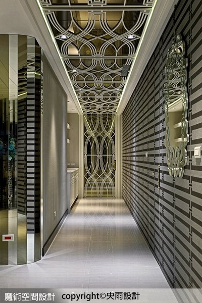 7.【圖說】王千乾設計師出神入化的精湛手法,將廊道天花延續臥房門片,幾何線條燦爛奪目,形塑美麗鏡帶無限延伸感。