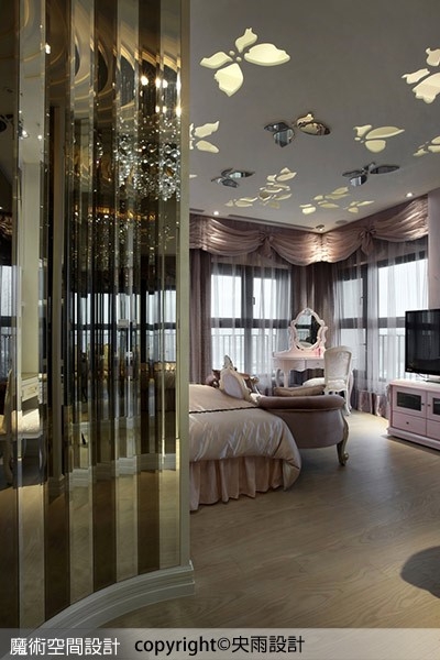 8.【圖說】臥房化解橫樑問題,運用波浪造型設計浮板式天花,鏤空花朵結合燈光並延伸到壁面裝飾,呈現夢幻氛圍。