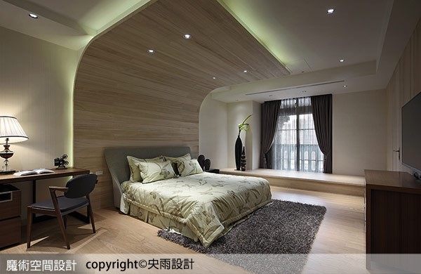 10.【圖說】臥房立面以木質拼組出流暢弧度延伸至天花,搭配柔和光源帶出獨特包覆感,成功修飾掉上方橫樑,俐落有型。