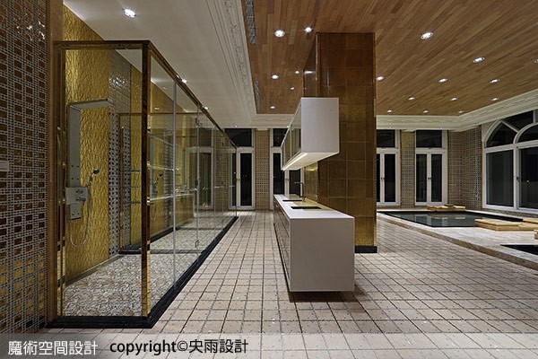 12.【圖說】豪華敞闊的SPA室,天花採用天然耐潮的紅檜木,材質色澤與水池內側燙金馬賽克相互烘托宮廷氣息,照明機能也一併整合於天花設計。