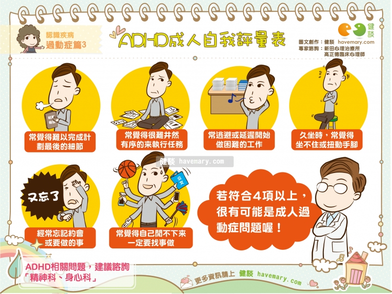 若上述6項問題中有4項以上符合,則很有可能是成人過動症問題喔!然而,高正德心理師提醒,若身體不適、失眠或壓力過大時亦可能出現上述六項困擾,建議自我評核時宜先排除這些因素再行考量。