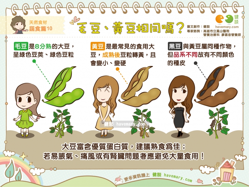 毛豆、黃豆,看似八竿子打不著的兩種食材,居然是相同的作物?高雄鳳山醫院廖嘉音營養師表示,毛豆、黃豆都是大豆,年幼的大豆呈綠色,也就是俗稱的毛豆,當大豆成熟後,豆粒會變小、變硬,就成了我們常看到的黃豆囉!