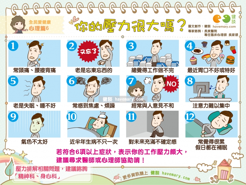 若上述題項回答有6~8個「是」,表示工作壓力頗大,建議可尋求醫師或心理師的專業建議。