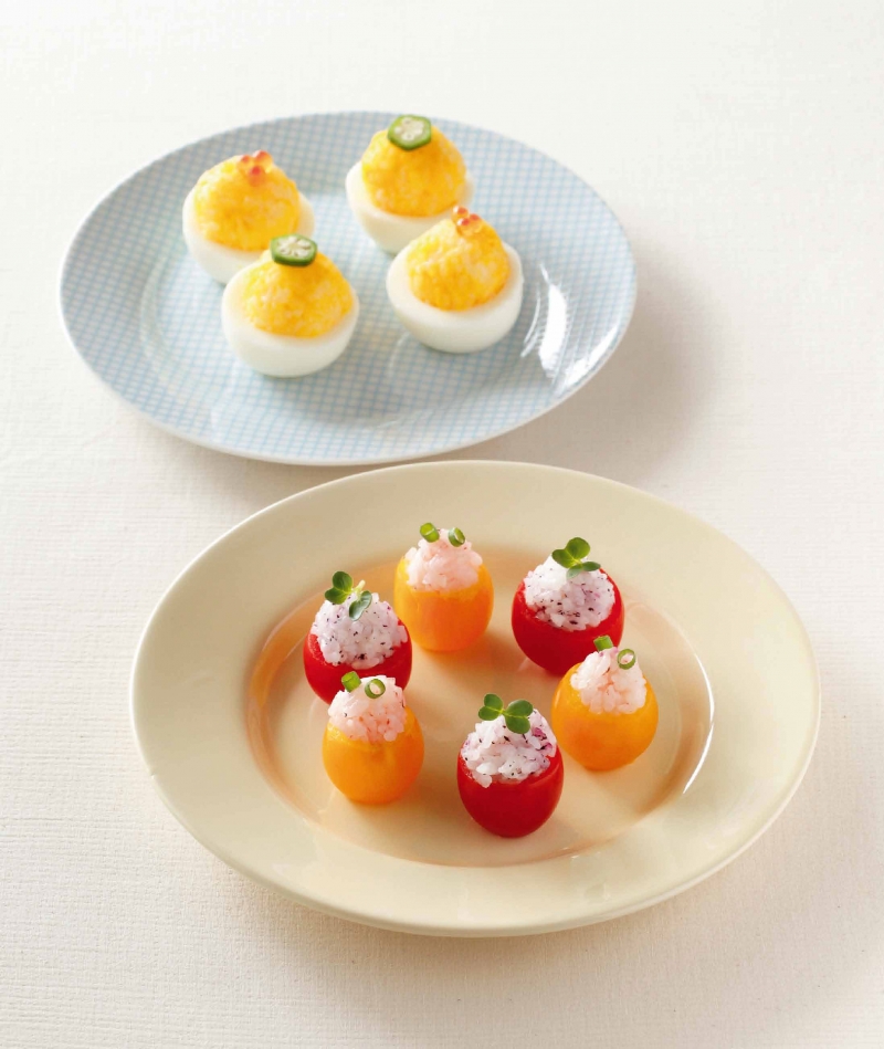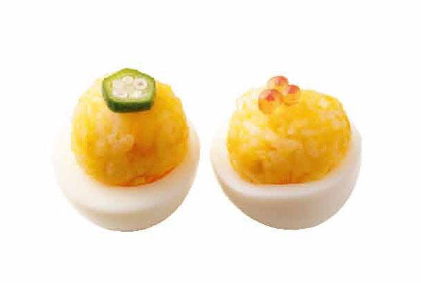 3 將作法 2 填入作法 1 的蛋白中,再分別擺上水煮秋葵與鮭魚卵。