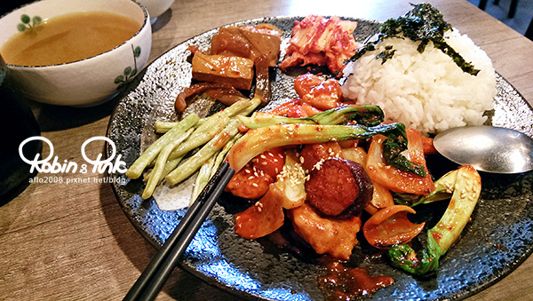 看了看MENU最後點了"辣炒雞腿肉飯",其實第一次吃應該吃他們的招牌"白切肉飯"才對,不過今天就是沒有很有FU,就是想吃點辣辣的東西,下次有吃再來補上好了!(沒辦法,胃只有一個),不過"辣炒雞腿肉飯"的雞腿肉真的很嫩很新鮮,調味上不知是不是道地的韓式風味,但醬汁味道香香辣辣的剛剛好很開胃,也不會太鹹,配菜有三種,豆子、泡菜和豆干,也都蠻不錯,整體來說是好吃而且也能吃飽,值得一吃!以商業午餐來說也算有誠意!