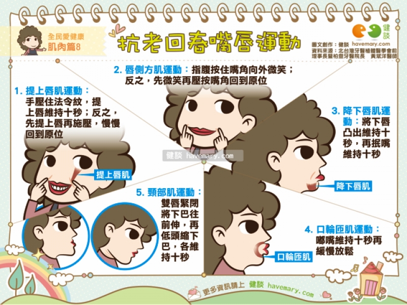 想要找回迷人的笑容,除了微整形之外,還有更自然的方式:運動!黃斌洋醫師傳授「蒙娜麗莎抗老回春嘴唇運動」動作分解如下: