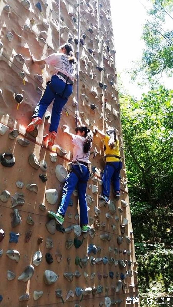 上午8點畢業攀岩典禮登場,先由攀岩隊做示範,再由他們做全程安全保護,所有安全措施設定完成,111位畢業生開始輪流攀岩。學校校園設有一座攀岩場,師長希望學生們能有勇氣面對未來的挑戰,因此從國中一年級開始就訓練學生們攀岩。