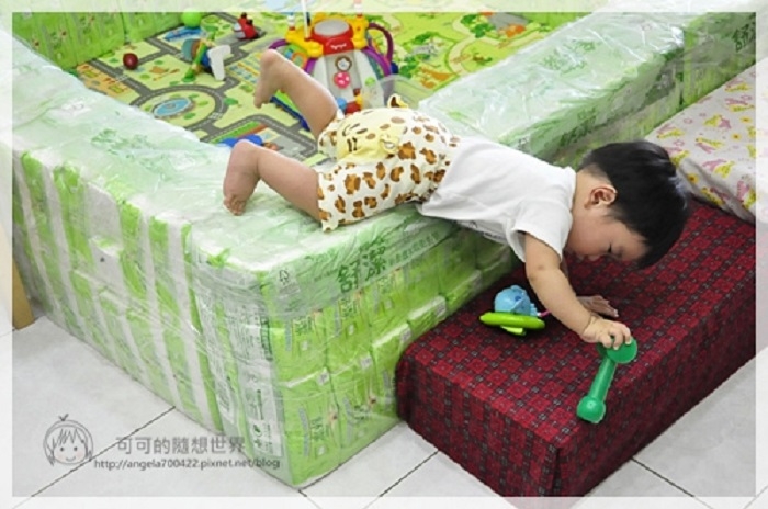 可樂媽還在衛生紙牆外放了〝地墊包〞,讓可可可以當樓梯踩進去,讓樂樂不小心摔出來時也不會頭直接著地。