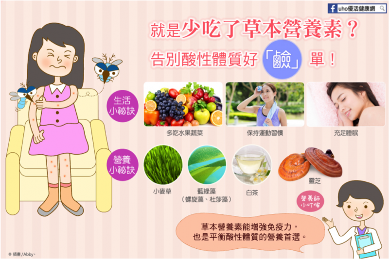 炎熱的夏天來臨,正是蚊蟲最愛出沒的季節,這個時候最容易看出誰是酸性體質。酸性體質最明顯的特徵除了容易被蚊蟲叮咬外,也會有很多潛在的病症,如容易感冒、免疫力低下…等。而哪些生活習慣容易造成酸性體質?要告別酸性體質和感冒的侵襲,需要補充哪些食物或保健食品?就讓營養師來告訴你!