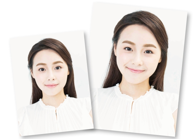 2.直4.5公分且橫3.5公分(不含邊框),以頭部及肩膀頂端近拍,使人像自頭頂至下顎之長度介於3.2公分至3.6公分(亦即臉部佔據整張相片面積的70~80%)。頭部或是頭髮不能碰觸到相片邊框(女性長髮碰觸相片邊框下緣情形例外)。