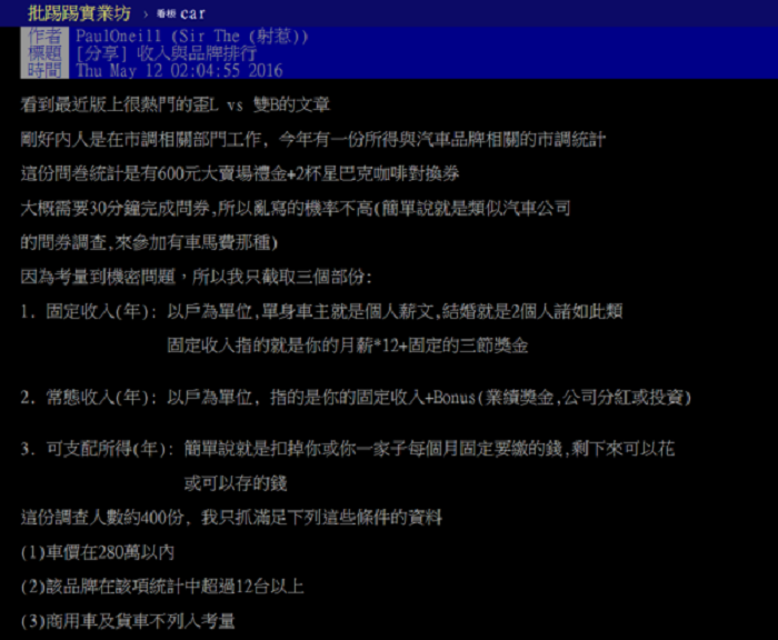 網友分享買車與薪資所得的關係,發現Mazda的車主花最兇。(翻攝自PTT)
