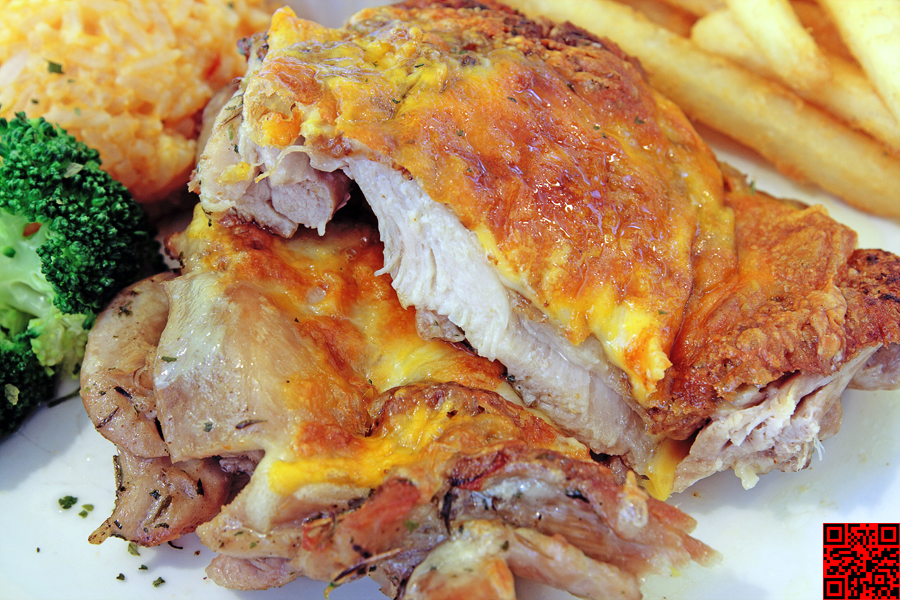 再搭配香濃起司一起輕火慢烤而成的雞腿排,