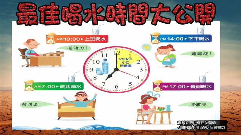 柯仁弘醫師建議,睡醒、餐前、運動前、白天 4個時間一定要補充水分!!很多人喜歡起床後先灌一杯冰水,自以為提神醒腦,但對身體造成傷害,最好是喝20-25度的溫開水,而且要空腹喝。
