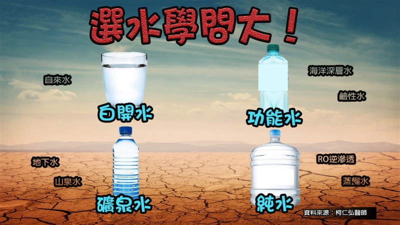 人平常會喝的水,種類很多,自來水、白開水、天然礦泉水、礦泉水、礦物質水 、純淨水、蒸餾水、茶水、飲料…等等,到底哪些水最適合人體飲用呢?柯仁弘醫師建議,其實白開水最適合人體飲用,也最健康環保,但必須注意的是燒開水的學問,水燒開後,蓋子打開來,開最小火,把抽油煙機和窗戶打開,讓揮發的三鹵甲烷排出室外。
