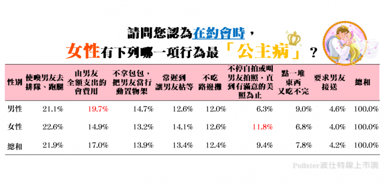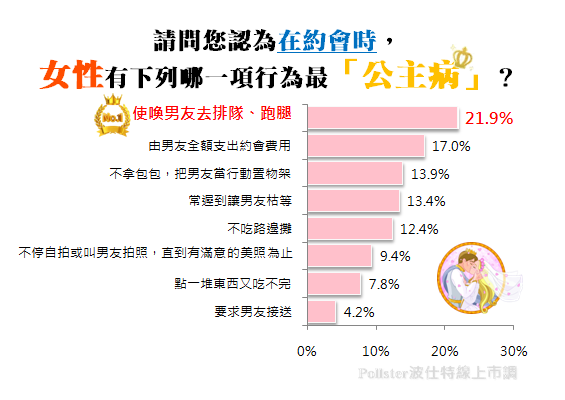 Pollster波仕特線上市調網詢問:「請問您認為在約會時,女性有下列哪一項行為最『公主病』?」結果顯示第一名是「使喚男友去排隊、跑腿」,為21.9%;其次是「由男友全額支出約會費用」,占17.0%;「不拿包包,把男友當行動置物架」則位居第三,為13.9%。其他依序為「常遲到讓男友枯等」(13.4%)、「不吃路邊攤」(12.4%)、「不停自拍或叫男友拍照,直到有滿意的美照為止」(9.4%)、「點一堆東西又吃不完」(7.8%)及「要求男友接送」(4.2%)。