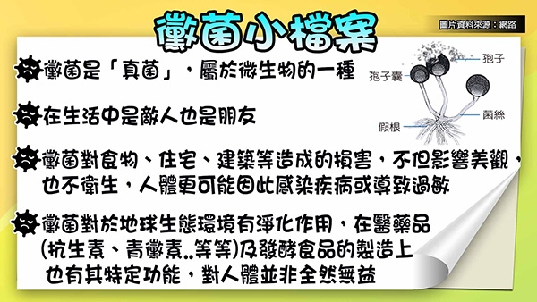 黴菌在生活中處處可見,到底為什麼會有黴菌?聽說黴菌還有分好黴跟壞黴?皮膚科醫師趙昭明就表示,黴菌在生活中是敵人也是朋友,但大多數的黴菌,都是壞朋友。黴菌是「真菌」,屬於微生物的一種,對於地球生態環境有淨化作用,在醫藥品(抗生素、青黴素..等等)及發酵食品的製造上也有其特定功能,對人體並非全然無益。但黴菌對食物、住宅、建築等造成的損害,不但影響美觀,也不衛生,人體更可能因此感染疾病或導致過敏。