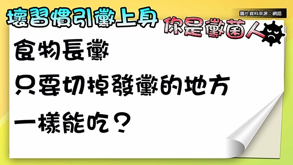 食物長黴,只要把黴去除掉,一樣能吃?趙昭明提醒,一旦發現食物發霉、過期,都應立即丟棄。許多人以為,只要把發霉的地方去除,就可以避免黴菌的毒害,事實上,看到發霉時,其黴菌菌絲早已深入食物內部。如果不小心吃到一、兩口壞掉發霉的食物,由於人體內有胃酸以及免疫機能的保護,可以不必太過擔心,但如果是吃到過量的發霉食物時,就可能造成食物中毒。