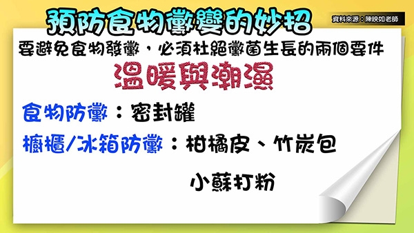 家事達人陳映如提供以下方法預防食物黴變: