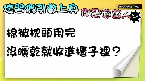 趙昭明醫師提到,台灣濕氣重,容易讓棉被、枕頭吸濕氣而潮濕發霉,甚至長塵螨。中醫師吳明珠也說到,棉被枕頭因為睡覺時會排汗,所以也會造成潮濕發霉,因此建議棉被約2個星期就要曬1次,如果沒有陽光,也可以利用烘乾機或開除濕機來烘棉被,以減少濕氣殘留。