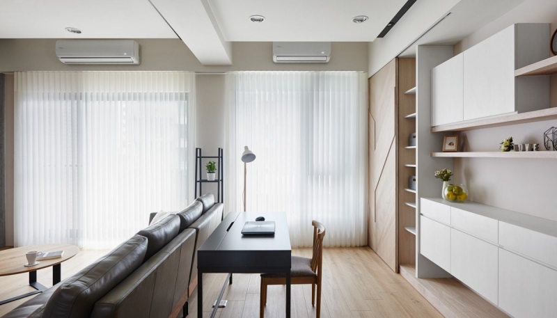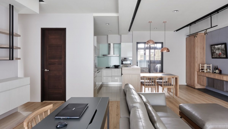 公共空間部分,書房、客廳,以及餐廚空間,透過大面積的落地窗無私地將日光迎攬入室,在淺色系木地板承接映襯下,整體氛圍散發純粹清爽感覺,並創造出輕盈無負擔的兩人生活。室內並採用大量的輕淺木色渲染,與純白色系的相互搭配,讓空間感更加清新脫俗。