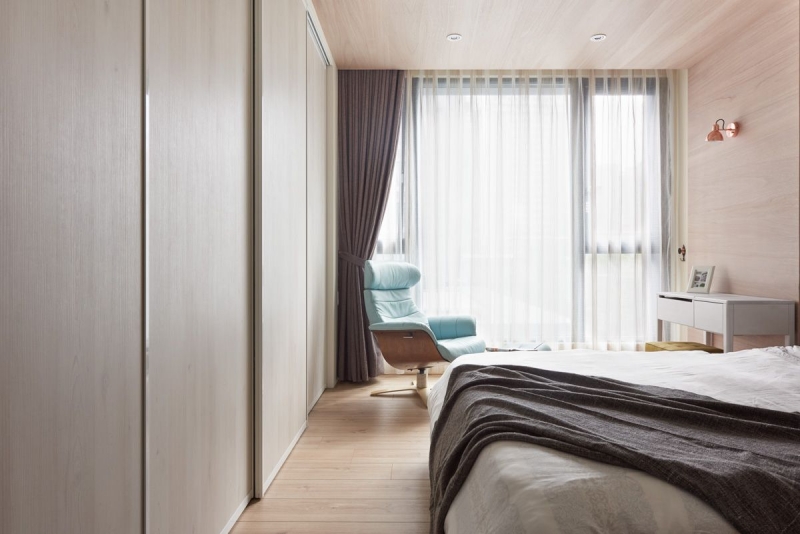 臥室區以淺色系為主,延續簡潔舒適氛圍,大片落地窗引入充沛的陽光,臨窗處以溫煦木色包覆,並搭配小躺椅,無論是作為梳妝區,或是午後休憩的小天地都相當適合,另外,淺色門板後也為夫妻倆安排了豐富實用的收納規劃。