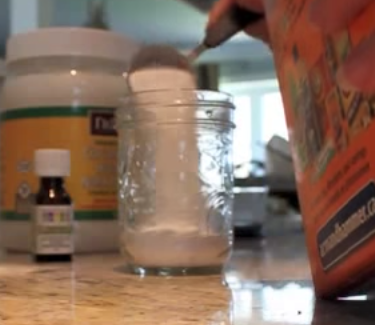 接著,將三勺小蘇打、及兩勺的椰子油放到一個容器裡攪拌均勻。