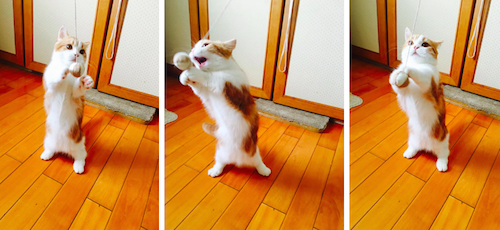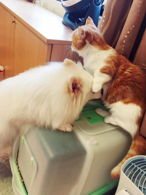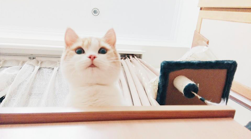 還有一次是諾亞躺在櫃子上休息時睡著,結果一不小心就從上面摔下來,波及到周圍的電風扇,不過明明是牠自己摔倒卻嚇得躲到一旁桌底下!每次都讓主人看完覺得好氣又好笑。