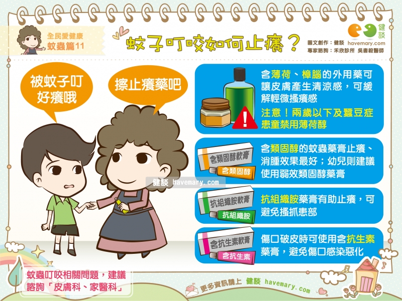 若搔癢感嚴重,則可使用含有抗組織胺或類固醇成份的蚊蟲藥膏,以達到止癢、消腫的效果。但是,有些人對於含有類固醇的蚊蟲藥膏會有疑慮,到底可不可以用呢?吳書毅醫師表示,蚊蟲藥膏中的類固醇含量通常不高,且蚊子叮咬的位置大多不會重複,僅短暫塗擦幾日並不會出現明顯的副作用;12歲以下幼童建議僅使用弱效類固醇,並縮短使用時間。然而,若想要使用在嬰幼兒的皮膚上、過敏體質、或對於用藥疑慮者,使用前最好先諮詢專業醫師、藥師的用藥建議。