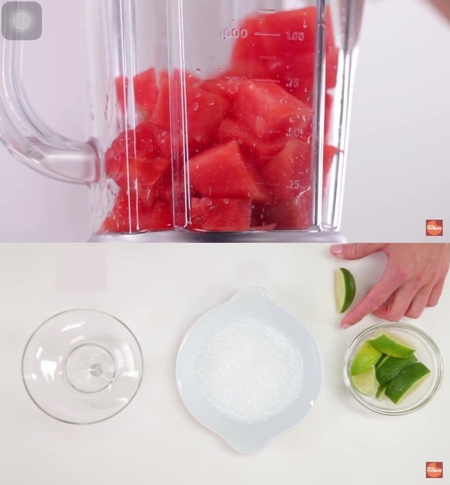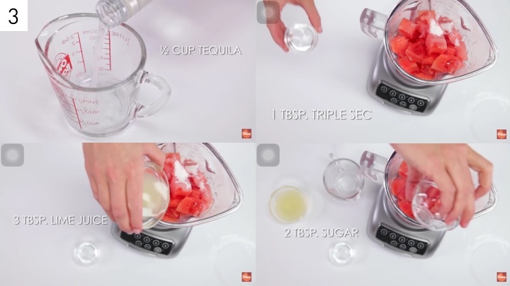 Step3.高腳杯備妥後,將西瓜塊、1.5杯龍舌蘭酒、2匙糖、3匙萊姆汁、以及1匙橙皮酒到倒入果汁機內。