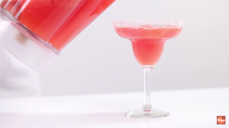 宛如在五星級飯店才能喝到,高級西瓜瑪格莉特雞尾酒誕生!可以依自己喜好在杯緣插上檸檬片或是挖成球狀的西瓜做裝飾喔!還有,若家中沒有高腳杯的話,像下面的圖一樣,用一般杯子也能做出高質感。