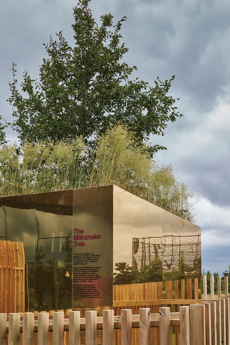 「The Milkshake Tree」裡有條斜坡道,一旁的木圍籬上還結合了銅製木琴,讓孩童經過時就能彈奏出聲響。更往裡走有一個12公尺的金色鏡面正方體,正方體內藏有玻璃稜鏡,透過鏡面上葉子形狀的小洞投射出萬花筒般的璀璨效果。