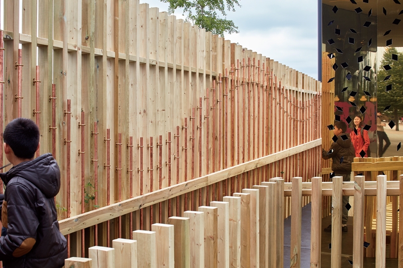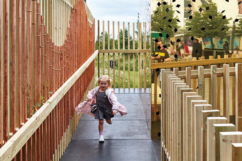 這座木圍籬是pH+ Architects所設計的倫敦腦性麻痺兒童中心的部分概念延伸,鼓勵孩童在遊戲中學習,接受各種感官刺激,從中建立獨立、自信等人格特質。