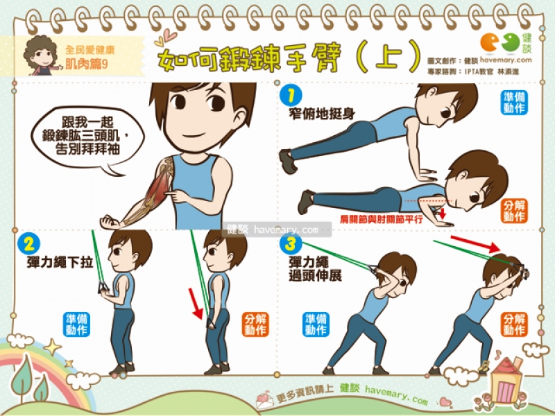 上述三項動作建議可每日利用空擋,花15至20分鐘運動,強化手臂肱三頭肌的肌肉強度,就會讓手臂線條變得更好看唷!