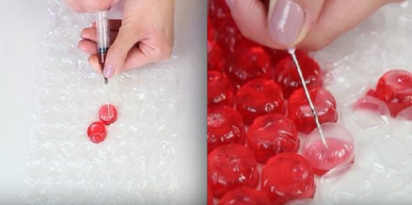 接著攪拌到有點凝固後,用注射器把果凍漿打入泡泡紙中!