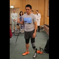熱愛運動的劉振明今天與太太出席門諾醫院記者會,他因車禍失去左腿後,曾經在義肢公司工作,負責組裝義肢,但看著自己穿的義肢,內心始終有著對運動的渴望,不斷的思考著,難道穿義肢就不能跑步嗎?直到半年前,劉振明找上了門諾醫院,不僅解決了他內心所有的疑問,也透過復健科團隊的協助,讓他有機會重回跑道,圓運動員的夢。