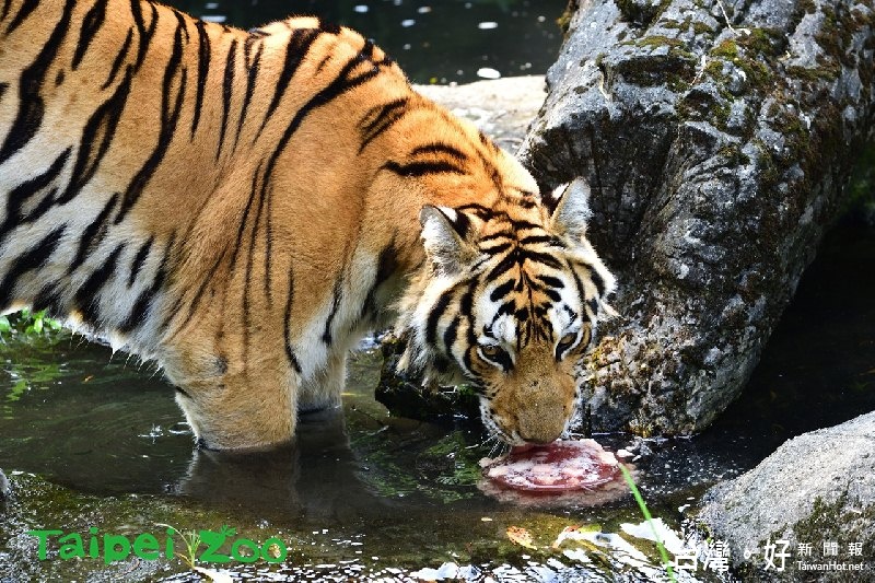 真的熱爆了!台北今天中午飆到38.5度,創下今年7月最高溫紀錄。台北市立動物園老虎開始吃冰消暑,泡在水池降溫,享受一下清涼時光。保育員貼心為老虎準備了「碎肉冰」,作為消暑和行為豐富化的材料,還有飲水和調節體溫的作用。動物園表示,只分布在亞洲的老虎,是體型最大的貓科動物,因為棲息地喪失、非法獵捕、遺傳多樣性威脅及自然災害等因素,估計全球僅存3890隻虎。