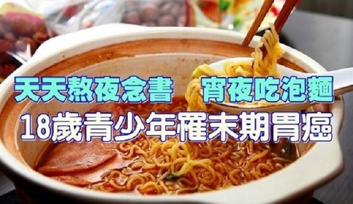 隨著近年來飲食西化、民眾飲食多不忌口,導致罹患胃腸道腫瘤的案例層出不窮,近期一則新聞報導提到一名備考階段男學生,五年來天天吃泡麵,沒想到等到出現 腹脹、噁心等症狀就醫時,就已確診為胃癌末期。由於胃為腹腔內中空的器官,早期幾乎不會有症狀,到晚期,症狀也是模糊且不具特異性,研究報告指出,腹痛與 脹氣為主要症狀,約占80~90%,其餘常見的症狀有食慾不振、體重減輕、嘔吐及解黑便等,約占50~60%,致病原因雖無法推論就是天天吃泡麵惹的禍, 但這類高鹽食物的確是導致胃癌的危險因子。