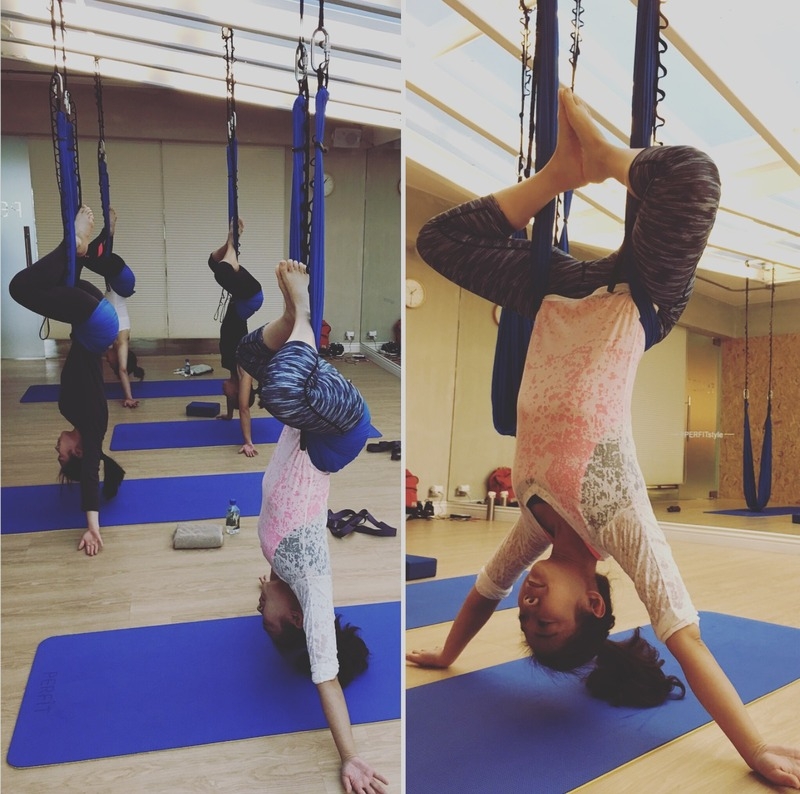 以在布面上支撐的時間多寡來決定強度,搭配不同難度的瑜珈動作來訓練手臂,像是飛行式下犬式牛面式魚式提臀抬腳舞皇式高空蝴蝶等,就能針對不同身體的部位來做伸展和運動!