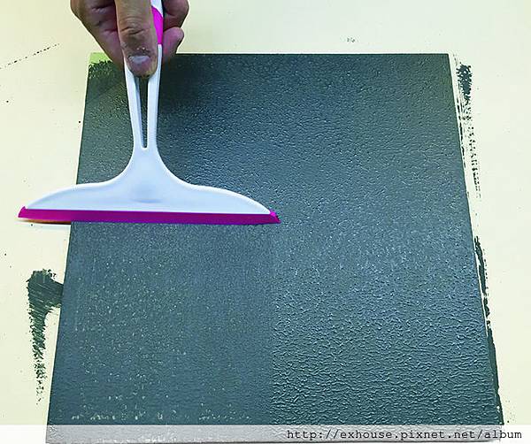 4 磁性漆呈半乾透時,以批、刮刀或平整工具,於牆面輕輕刮平即可,如完全未乾透刮平,可能導致磁性漆完全被刮起;如完全乾透即刮平,將無法整平。