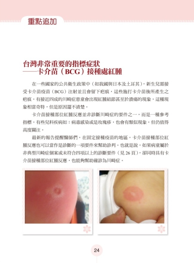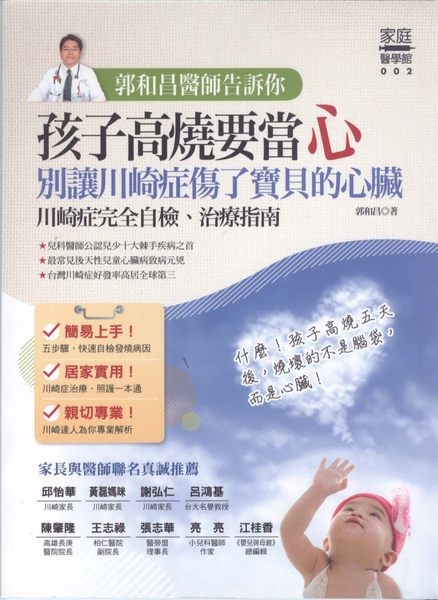 本書由創設台灣「川崎症」門診第一人郭和昌醫師執筆,詳盡解說川崎症相關知識與正確醫療方法,並特別提供「體溫觀察記錄表」、「川崎症快檢表」、「川崎症治療流程圖」、「川崎症與其他疾病的區別」以及「發病時的照護」與「後續照護」等實用圖表,方便家長及醫師進行判斷與照護。隨書亦附贈「川崎寶寶護照(隨身版)」,方便家長追蹤家中寶貝就醫記錄、提醒疫苗施打時間。