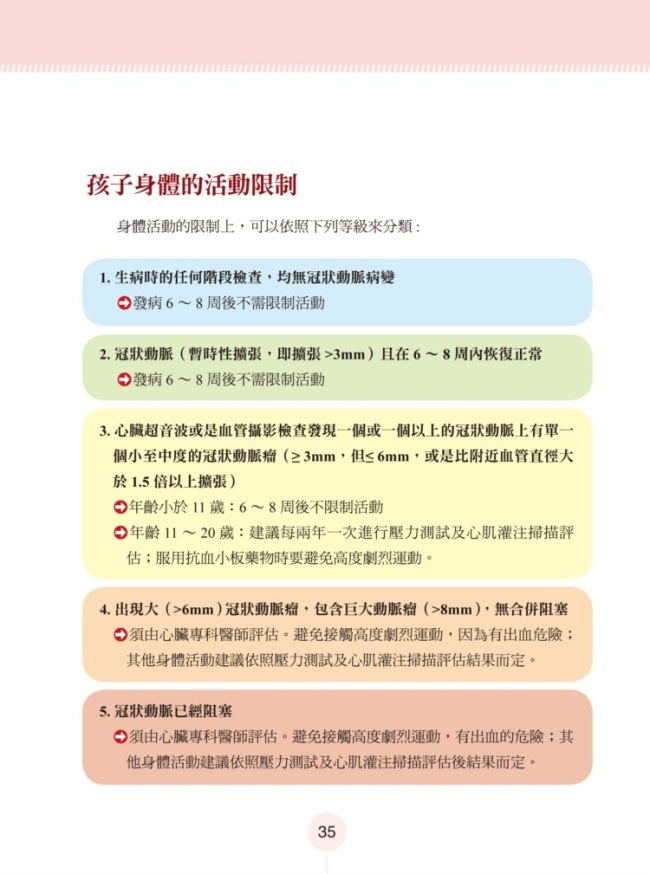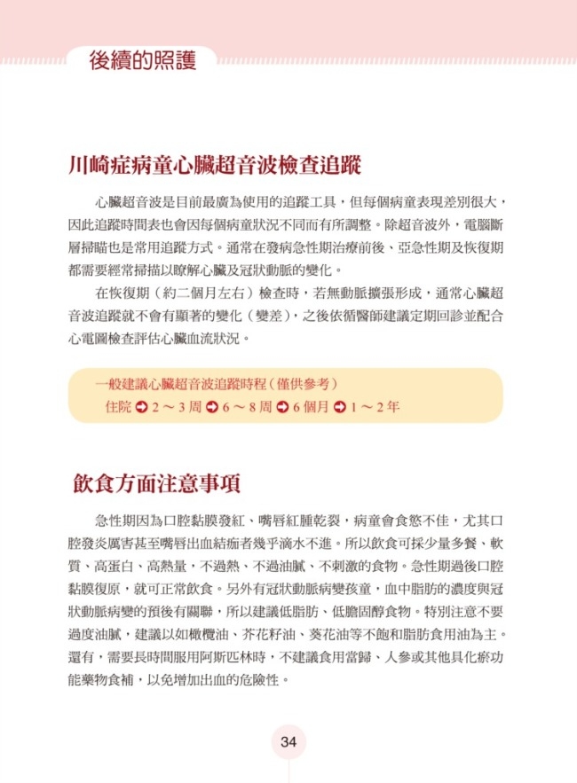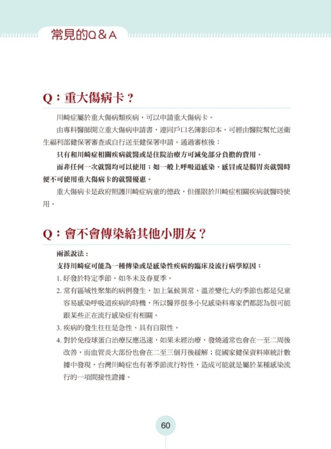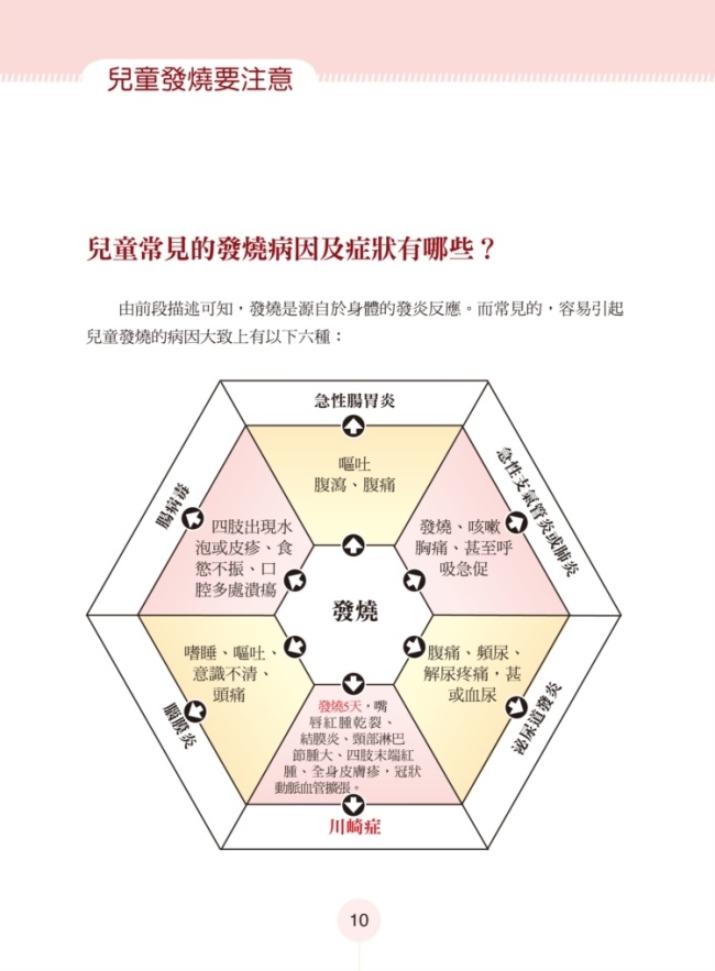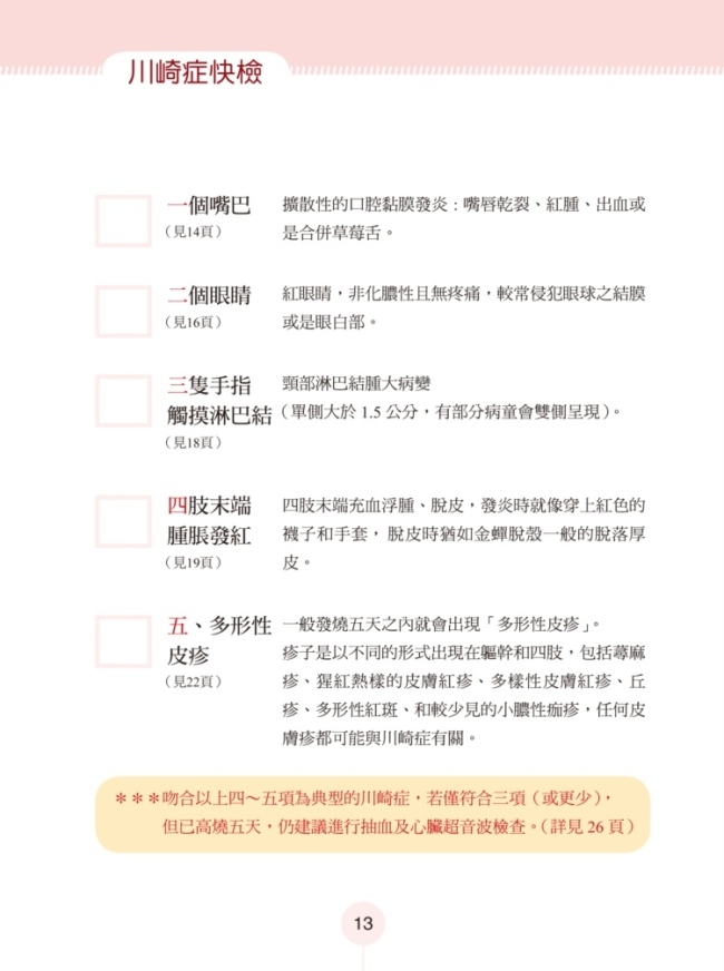 事實上,發燒是源自於身體的發炎反應,對人體是有保護作用的。不過,若你的孩子發燒38.5℃以上,且持續五天以上,那麼請你務必要打開本書第13頁,進行「川崎症快檢」,因為孩子可能是得了「川崎症」,必須立即到醫院進行心臟超音波檢查並接受治療。