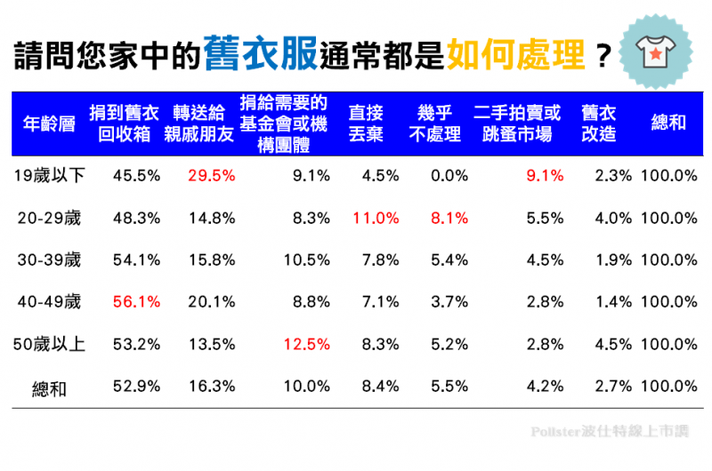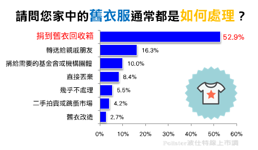Pollster波仕特線上市調網詢問:「請問您家中的舊衣服通常都是如何處理?」結果顯示超過半數(52.9%)的受訪者會「捐到舊衣回收箱」;其次是「轉送給親戚朋友」,占16.3%;也有一成(10.0%)受訪者選擇「捐給需要的基金會或機構團體」;而選擇「二手拍賣或跳蚤市場」或「舊衣改造」的受訪者僅有6.9%。另外,選擇「不再利用」舊衣服的作法如「直接丟棄」及「幾乎不處理」的受訪者共占13.9%。可見不論以何種形式,高達86.1%的受訪者還是會選擇「再利用」的方式來處理家中舊衣服。