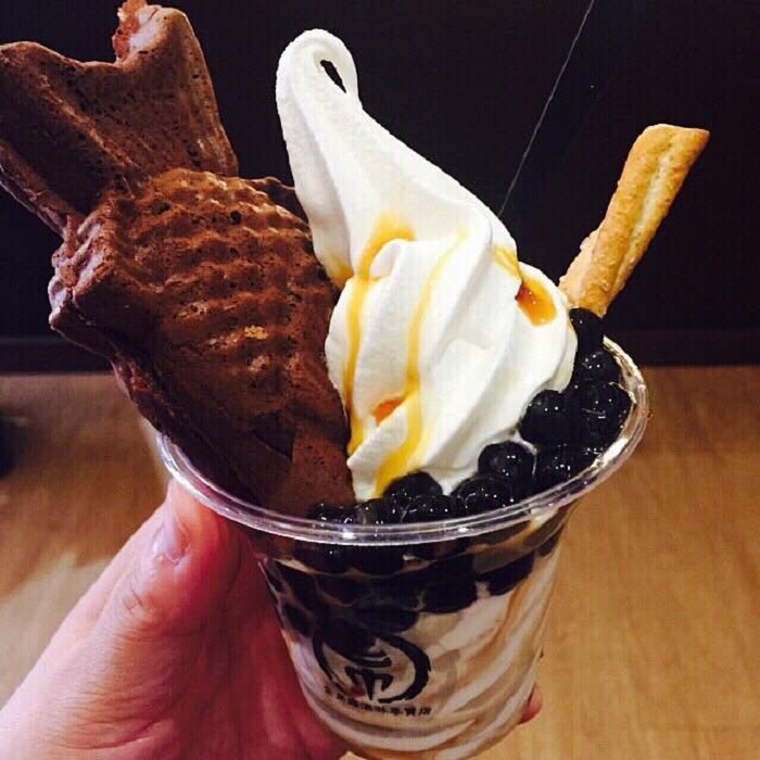 金帛的霜淇淋每日都會有兩種口味,像是紅茶牛奶、奇異果、覆盆子、芒果等等,而鯛魚燒則是固定的黃金、抹茶、熔岩口味,還可以依自己喜好加上珍珠。紅茶牛奶霜淇淋加上波霸珍珠,再搭配剛出爐的鯛魚燒,冷熱交融的珍奶口感讓人充滿驚喜~