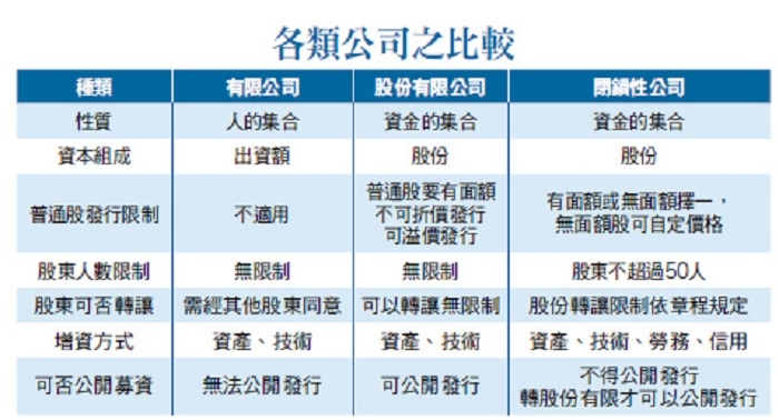 傳統的公司法年久失修,有三分之一左右是用不到的,因為公司法規定了無限、有限、兩合及股份有限公司四種形態的公司,其中無限公司及兩合公司相關規定沒太多人在使用,常用的也只是有限公司及股份有限公司兩種。若是創業者開公司的起步時,我們通常會建議採用設立有限公司的方式來滿足新創公司的營運需求,等到慢慢團隊到位了,需要將公司的規模改大一點時,才會建議由有限公司改組為股份有限。