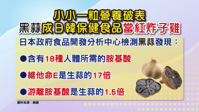 口湖生產合作社總經理王益豐解釋,日本政府食品開發分析中心在2005年所做的檢測發現,熟成後的黑色大蒜,含有18種人體所需的氨基酸,具有抗氧化作用的維他命E,是未熟成前白大蒜的17倍,游離氨基酸也是生蒜的1.5倍,消息公布後,立刻登上日本保健食品產業榜首。日本還有研究指出每日吃大蒜40克,能增強體力、提升免疫力、改善失眠、抗老、預防心血管疾病、促進消化和血液循環等,近年亦投入黑蒜加工技術研發,日本知名藥妝品牌早推出熟成發酵黑蒜錠,訴求為無精打采、需調節便秘或改善睡眠的人。