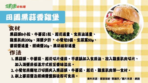材料:黑蒜頭8小粒、牛蕃茄1粒、起司適量、食用油適量、雞里肌肉200g、海鹽少許、小餐包5個、生菜葉50g、蕃茄醬適量、照燒醬20g、黑胡椒粉適量