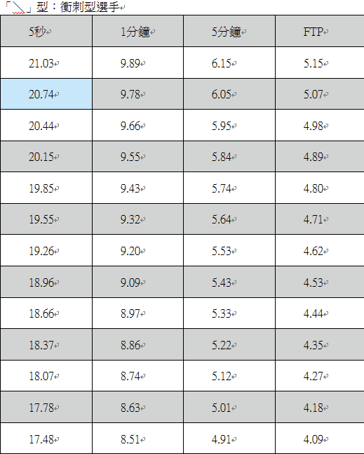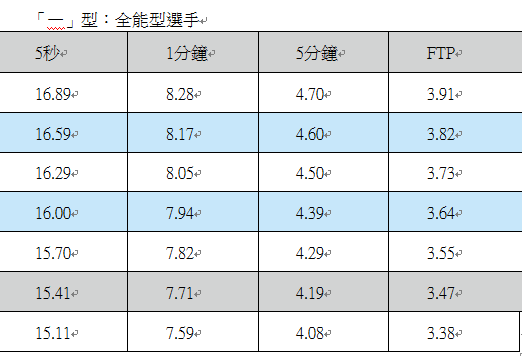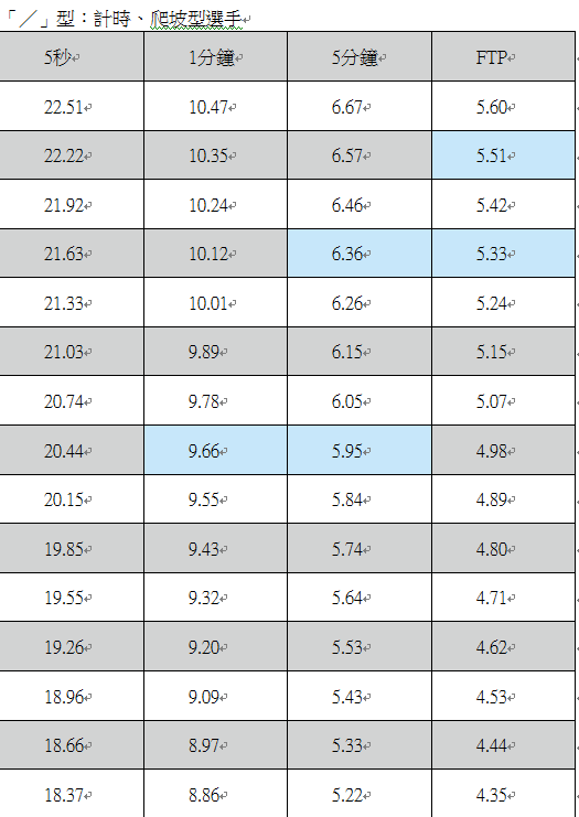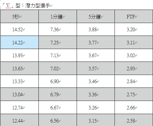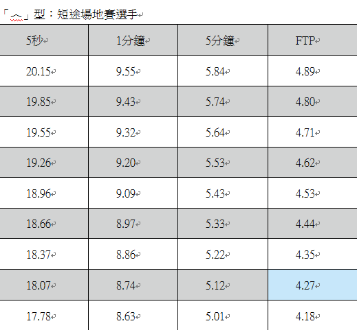功率體重比對照表,除了FTP的功率體重比之外,分別還有5秒、1分鐘、5分鐘的比值。我們可以分別檢測出這四個項目的最大平均功率,再利用這個表格找出自己的「功率資料圖表」(Power Profile)。這個圖表就是把四個點連成一條曲線。這樣除了可以知道自己屬於什麼等級(世界級、國家級,抑或是一般的休閒車手),更可以透過客觀的方式,判斷自己及其他選手偏向於哪一種類型,並進而成為找出個人強項與弱點的工具,修正訓練方向,制定出更完善的訓練計畫。接下來將說明該如何檢測不同時間的最大平均功率,以及不同形狀的曲線所代表的意義。