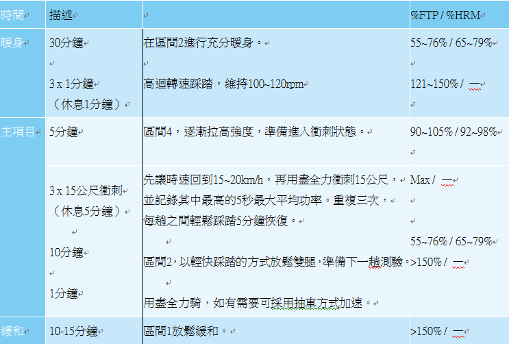 要找出自己是偏向於哪一種類型的車手,就得先檢測出5秒、1分鐘、5分鐘、20分鐘的最大平均功率。如果你已經是功率計的重度使用者,可以從近期的訓練或比賽紀錄中找出來。沒有的話,可以照著本書的「5分鐘+20分鐘計時測驗」找出5分鐘跟20分鐘的最大平均功率,以及下面的流程找出5秒和1分鐘的最大平均功率,兩次測驗之間最好能間隔一~二天,避免安排在同一天,以免影響數據的可信度。分別檢測完四個項目的最大平均功率後,同樣根據當時的體重換算成功率體重比。建議測驗前至少安排二~四天的減量訓練,且每項測驗都必須要確保是在最佳狀態下、用盡全力去騎,得到的結果才會準確;而較為進階的選手通常會在高強度競賽的刺激下(例如終點前5~10秒的全力衝刺),獲得最佳的功率數據。