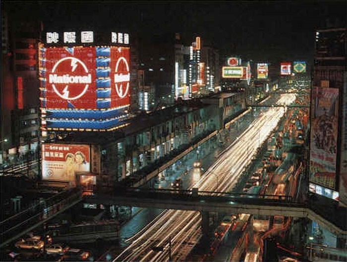 我對西門町的憧憬來自於閱讀,從《讀者文摘》的照片,從《電視週刊》的照片,那些邵氏武俠片或瓊瑤三廳電影在西門町電影院上映盛況的報紙娛樂版,還有愛國電影類似《梅花》《英烈千秋》《筧橋英烈傳》在電影街造成「萬人空巷」的照片。不過,最吸引我的其實是作為圓環天橋背景的大型霓虹廣告看板,以及看板右側連棟的中華商場,照片應該是從遠東百貨這一側拍攝,究竟是從哪本雜誌或《電視週刊》看到的圖片,已經想不起來了。