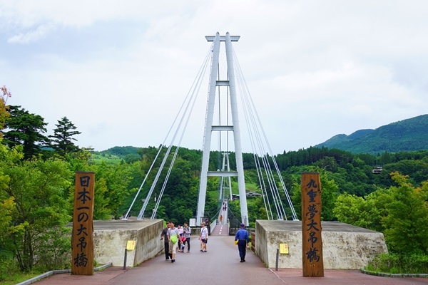 順遊必玩的景點還有「九重夢大吊橋」,建於海拔777公尺的山上,長390公尺,距離谷底173公尺,是日本最長、最高的行人專用吊橋,可同時容納1200人,又有「天空的散步道」、「空中走廊」等稱號,行走在吊橋上,可觀賞被選為「日本瀑布百選」之一,由雄瀑布及雌瀑布所組成的震動瀑布,壯麗的九重連山以360度無死角之姿映入眼簾,氣勢磅礡非凡,四季風情各異,夏季時分山巒翠綠蔥鬱,秋天紅葉浪漫璀璨,冬季山頭染上純白雪色,又是另一番迷人風景,據說到九重夢大吊橋一遊,可讓人夢想成真。